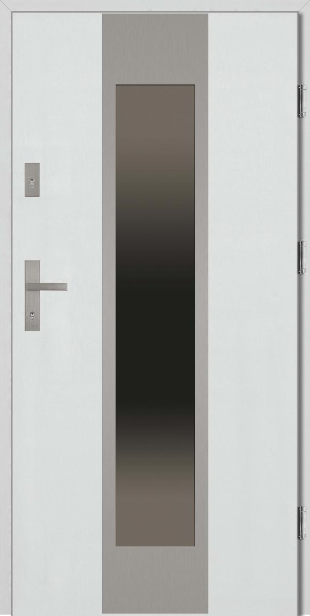 Skrzydło przeszklone wykonane jest w wersji przylgowej o grubości 68 mm. Zewnętrzną powierzchnię wykonano z najwyższej jakości blachy ocynkowanej ogniowo pokrytej drewnopodobną okleiną PVC. Wypełnienie termoizolacyjne stanowi polistyren ekspandowany. W skrzydle zamontowano ramiak drewniany osadzony wokół skrzydła oraz wzmocnienia w miejscu osadzenia zawiasów i zamków. Standardowo drzwi wyposażone są w dwa zamki trójbolcowe na wkładkę patentową w systemie 1-klucza. Skrzydło wyposażone jest w trzy bolce przeciwwyważeniowe. Ościeżnica drzwi wykonana jest z kształtownikow stalowych, ocynkowanych, pokryta laminatem drewnopodobnym. Istnieje możliwość dokupienia  ościeżnicy ENERGO lub TERMO